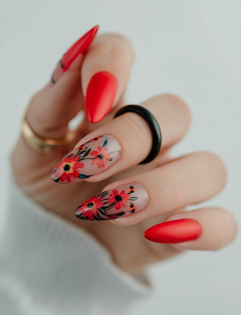 A striking almond manicure that plays with contrast, this set features a vibrant solid color matte red paired with sheer floral accents. The hand-painted flowers on a translucent base create a soft, artistic effect, balancing the bold colors. The design is a perfect fusion of elegance and statement, making it a trendy choice for spring gel nails ideas 2025. The matte and glossy textures add depth, making this look both modern and edgy.