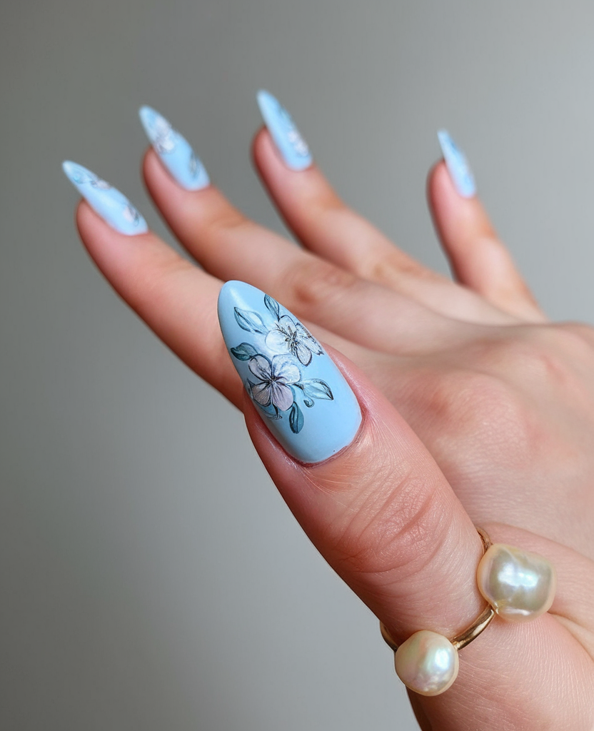 #13 Sky Blue Almond Nails with Delicate Floral Art