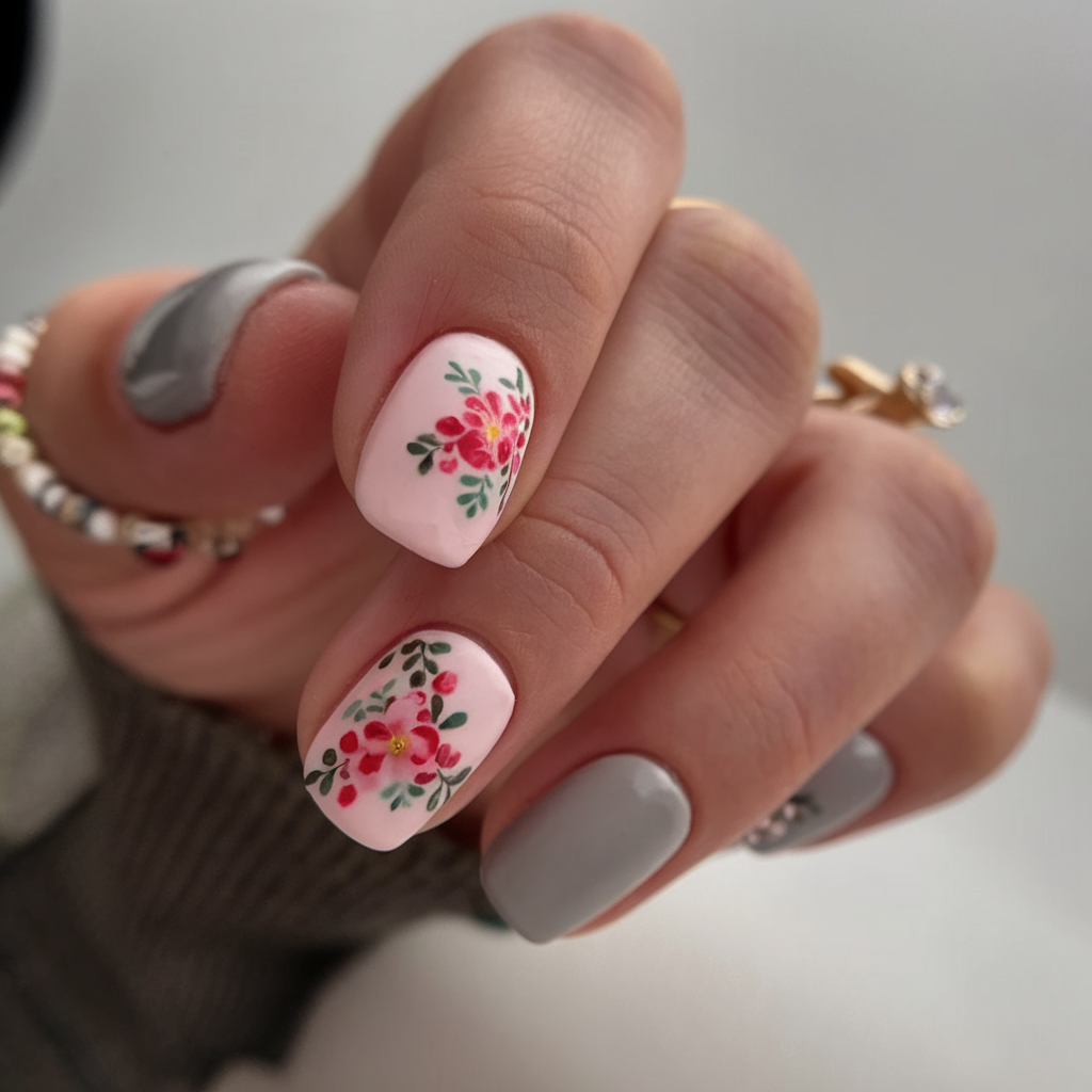A chic short square spring set, this manicure combines soft pastel pink with muted gray, creating a stylish contrast. The hand-painted floral accents on selected nails add a boho and feminine vibe, perfect for spring gel nails ideas 2025. The solid color nails balance the intricate design, making this look both playful and sophisticated. The glossy topcoat ensures a fresh and polished finish, adding a modern touch to the floral aesthetic.