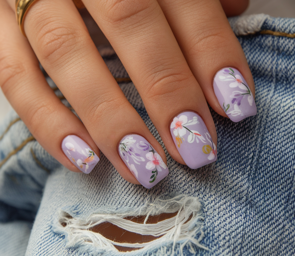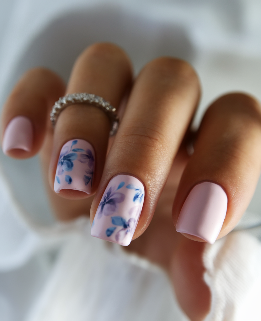 A gentle lavender base serves as the perfect canvas for hand-painted blue floral details, adding a touch of elegance. The soft, blended flowers create a watercolor-like effect, making the design feel light and airy. A matte top coat gives the nails a velvety finish, enhancing the softness of the overall look.