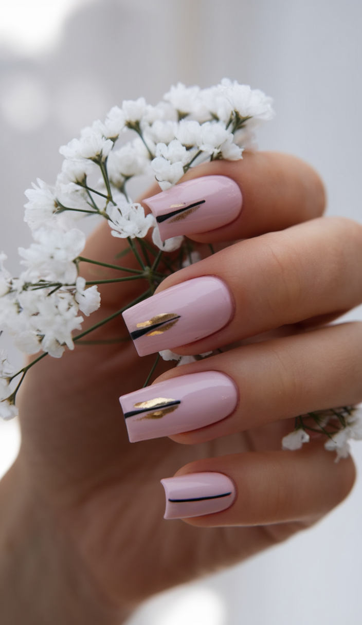 #10 Pink Square Nails with Minimalist Gold and Black Accents