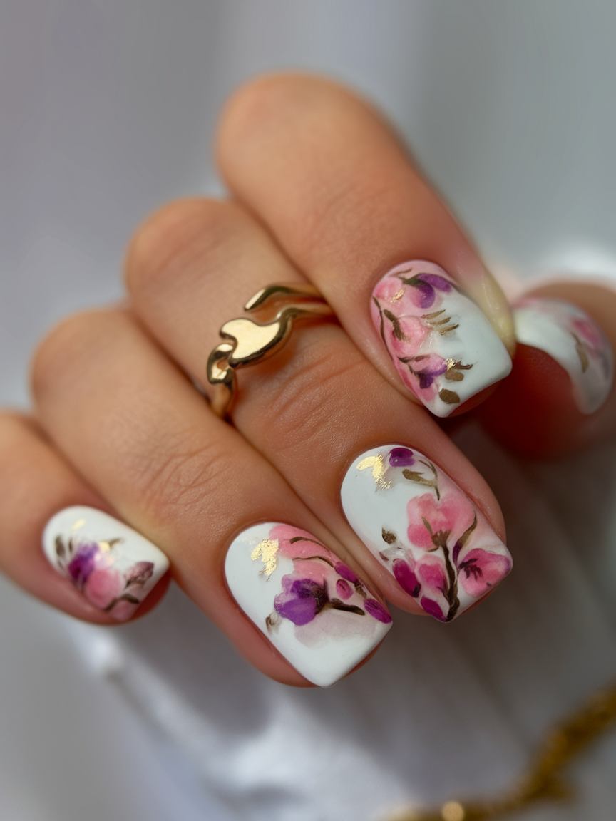 A stunning short square spring set, this manicure showcases a crisp white base with delicate hand-painted floral details in pink, purple, and gold. The watercolor effect creates a soft and artistic design, while gold foil accents add a hint of glamour. The glossy finish enhances the colors, making this trendy manicure an elegant choice for spring gel nails ideas 2025. This biab look is perfect for those who love artistic and nature-inspired nail art.