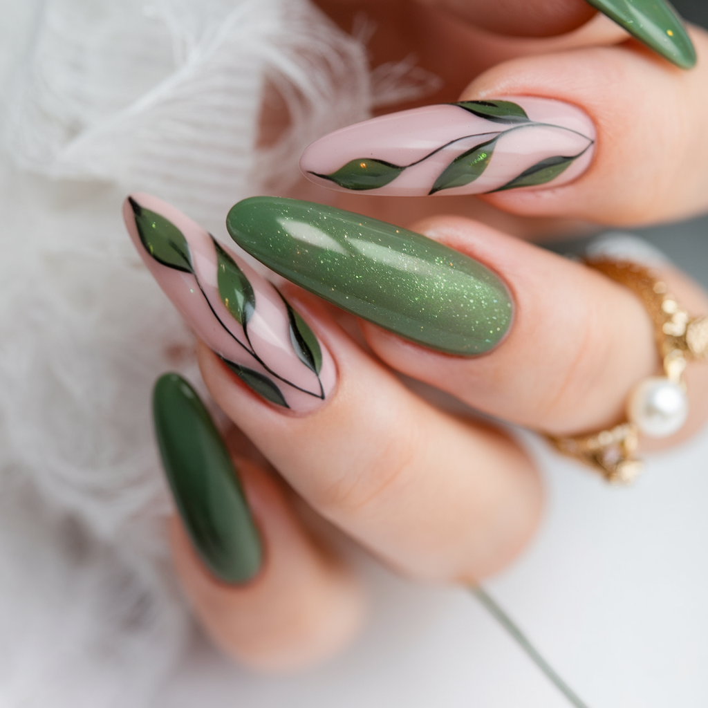 This 2025 almond manicure blends deep solid color green with a translucent nude base, decorated with intricate leaf patterns. The dipped effect creates a unique, nature-inspired design, perfect for a boho and earthy aesthetic. A hint of shimmer on the green nails adds dimension, making this set a perfect choice for those who love a bold yet organic look. This trendy style is ideal for the spring season, balancing elegance and creativity.