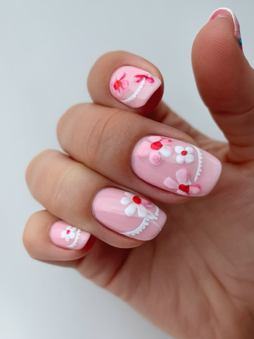 This short square spring set features a soft pastel pink base with intricate 3D floral details. The raised petals and delicate lace-like accents add texture, making this design playful and feminine. The combination of solid color and sculpted elements creates a fresh and youthful look, perfect for spring gel nails ideas 2025. A glossy finish enhances the soft pink tones, giving this manicure a delicate charm.