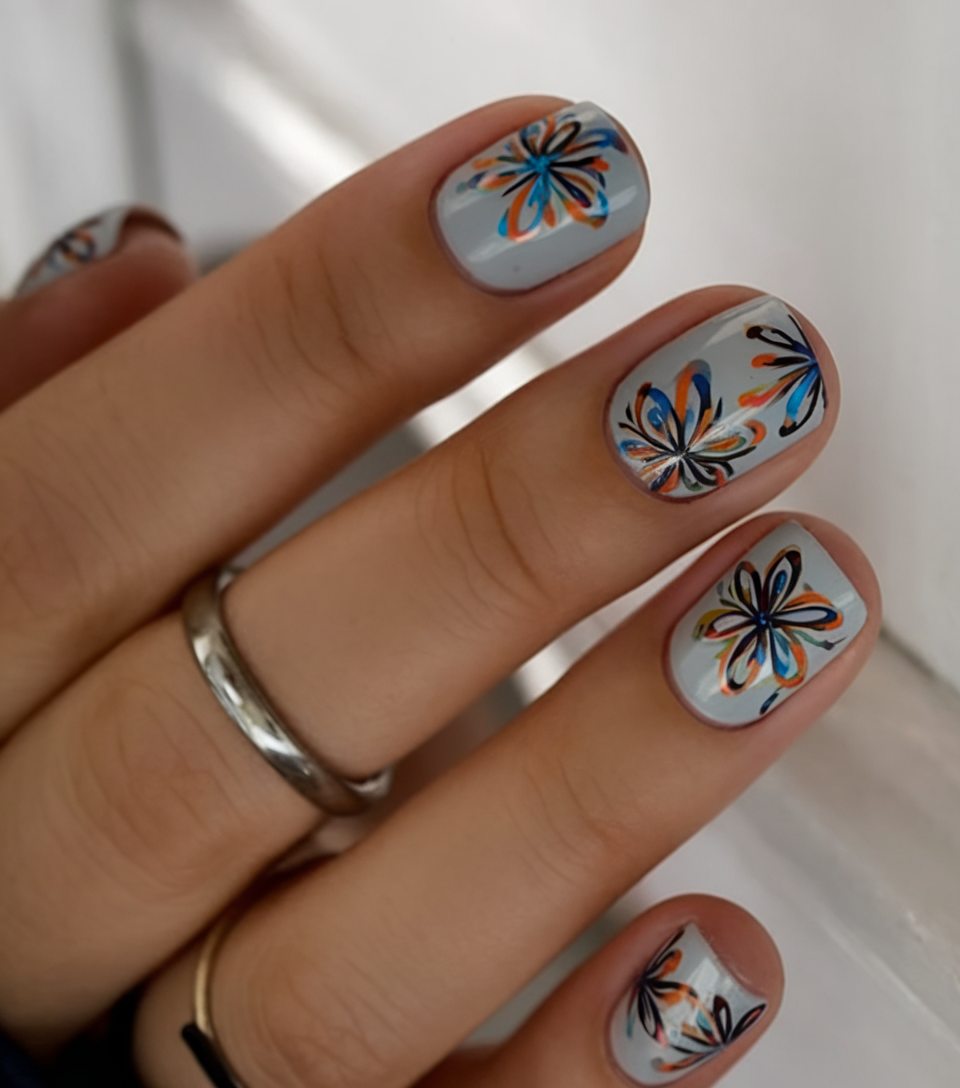 A perfect short square spring manicure, this set features a light blue base with hand-painted floral bursts in bold yet delicate strokes. The colors range from orange to navy, creating an artistic contrast with the pastel backdrop. The design is trendy and fresh, ideal for those who love unique nail art but prefer a short, natural nail length. This biab manicure is a great way to embrace the spring season without going overboard.