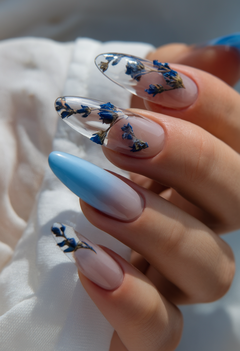 This enchanting design combines transparency with dried blue flowers encased in a crystal-clear gel for an ethereal effect. The ombré blue accent nails add dimension, complementing the floral encapsulations seamlessly. The elongated almond shape enhances the delicate and artistic nature of this design, creating a romantic yet modern appeal.