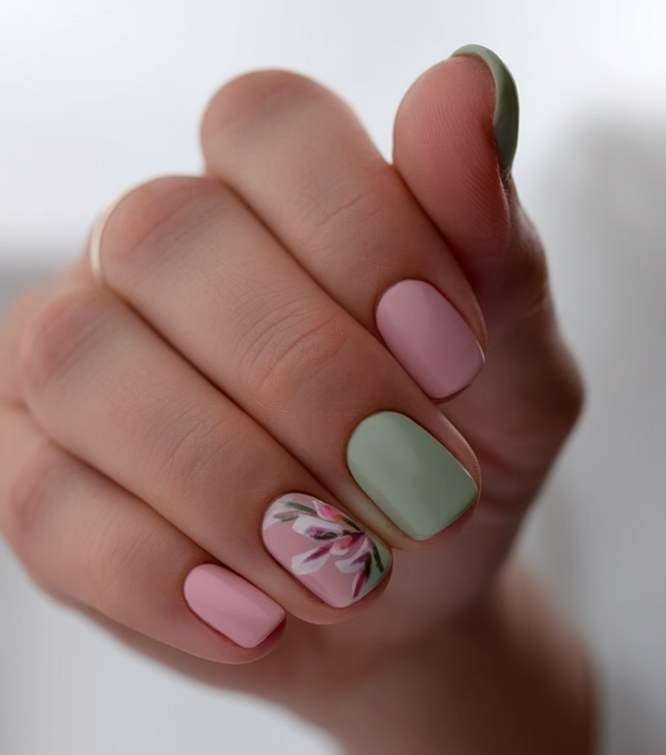 A fresh take on spring pastels, this set features soft pink and sage green in a matte finish for a sophisticated touch. A single accent nail showcases a delicate floral motif, blending white and soft pink petals with hand-painted green leaves. The combination of muted shades and negative space gives this look a minimal yet feminine aesthetic.