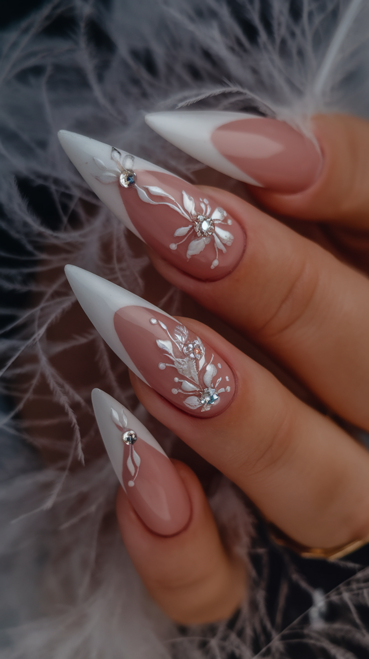A modern twist on the classic French tip, this 2025 almond shape nail design combines a solid color nude base with sharp white tips. Delicate white floral detailing adds an intricate touch, while the crystal embellishments give the manicure a luxurious feel. The acrylic extension provides durability, making it perfect for a break from everyday simple nails. This set is a sophisticated choice for those looking to elevate their spring gel nails ideas 2025 with a touch of glamour.