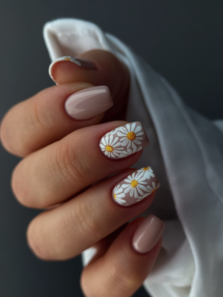 A charming short square spring manicure, this design embraces a subtle solid color nude base with hand-painted white daisies. The floral details add a boho touch, making this a trendy and playful choice for spring gel nails ideas 2025. The combination of acrylic extensions and soft neutral tones keeps the nails stylish yet practical. This set is perfect for those who want a floral-inspired nail look without overwhelming patterns.