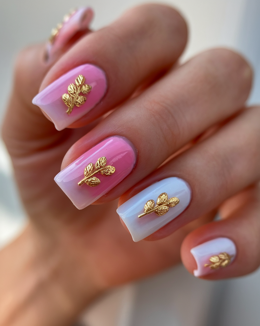 This 2025 square manicure features a dreamy ombre transition from pink to white, enhanced by gold leaf embellishments. The gradient effect adds depth, while the metallic accents give the design an elegant touch. The dipped technique used here creates a seamless blend of colors, making it a timeless choice for spring. A glossy topcoat completes this set, ensuring a polished and refined finish.