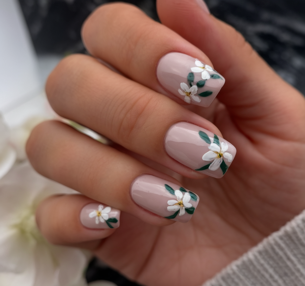 This short square spring nail design features a soft solid color nude base adorned with delicate white flowers and green leaves. The hand-painted floral accents add a fresh and natural boho feel, perfect for the spring season. The glossy topcoat enhances the elegance of the colors, making this set a subtle yet stylish choice. This look is ideal for those who prefer a timeless and feminine biab manicure.