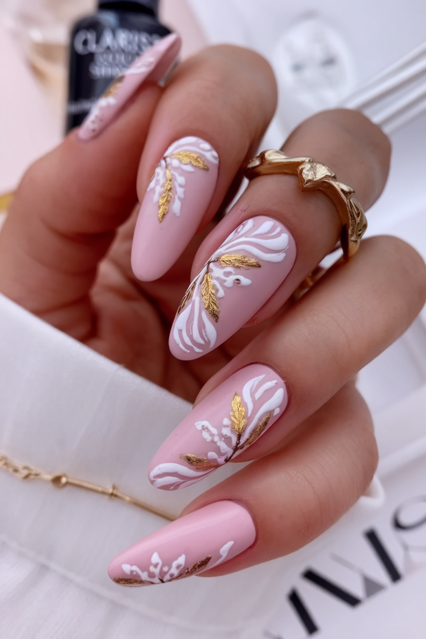 A refined 2025 almond manicure, this set embraces a pastel pink base with intricate white and gold detailing. The embossed floral design gives a luxurious feel, while the gold foil accents add a trendy twist. The acrylic extensions provide length and durability, making it a perfect choice for those who love sophisticated nail art. This look blends classic elegance with a modern spring gel nails ideas 2025 aesthetic.