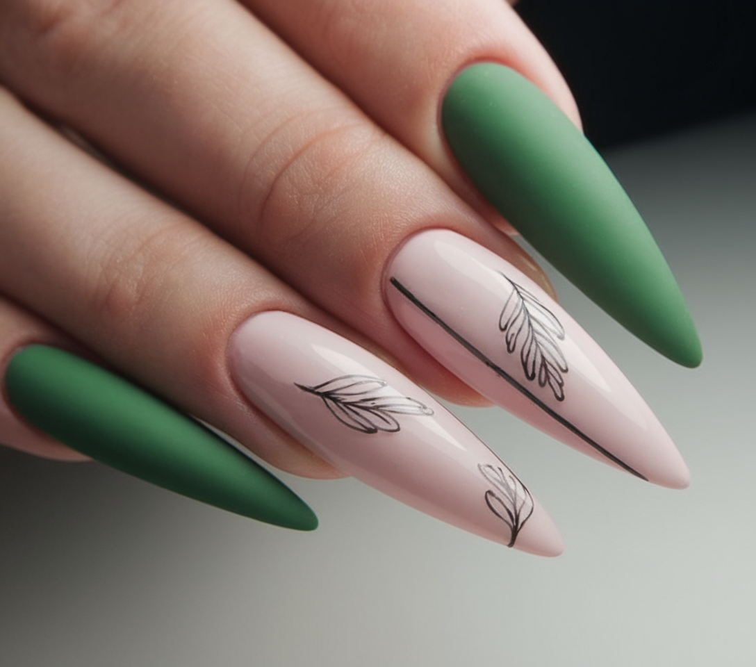 This 2025 almond nail design stands out with its unique contrast between matte green and glossy solid color pink. The fine black leaf sketches create a boho and modern appeal, elevating the minimalist aesthetic. The matte green nails add a bold, earthy touch, making this set a fresh take on trendy spring manicures. This look is ideal for those who love a combination of soft elegance and bold expression.