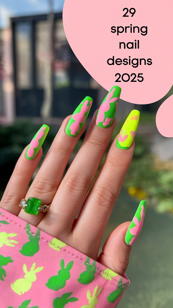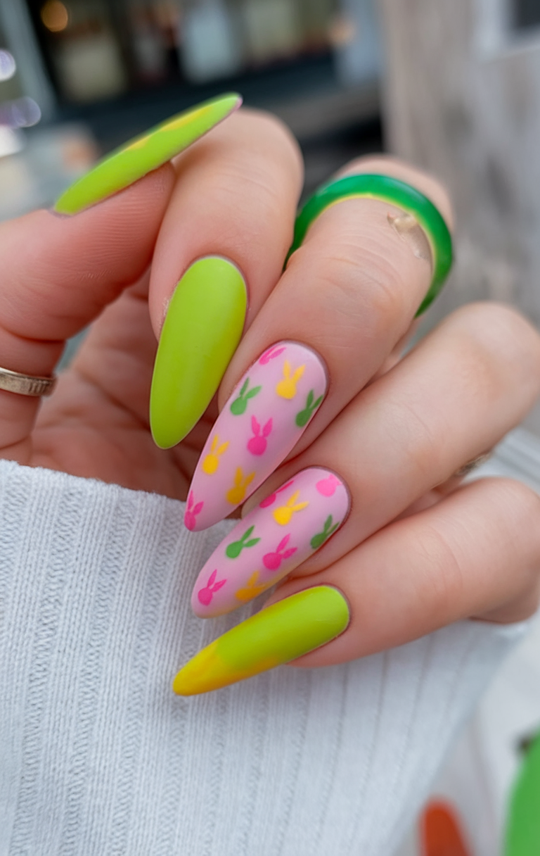 This cute and playful spring nail designs 2025 set features a soft pink base with tiny bunny silhouettes in green, yellow, and orange. The solid neon green nails balance the look with a fancy yet fresh pop of color. The matte finish keeps the design soft, making it an easy, fun choice for the season.