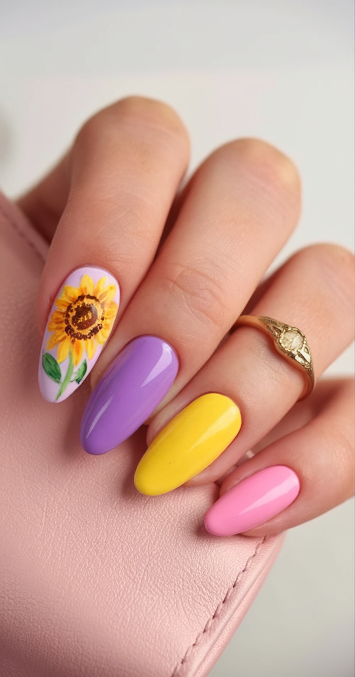 This pretty nail design features a hand-painted sunflower on a pastel base, combining yellow, pink, and purple tones. The accent nail with the floral detail adds a boho touch, while the other nails stay basic yet cute with smooth, glossy finishes. The combination of orange, lavender, and bright hues makes it an ideal trendy choice for spring.