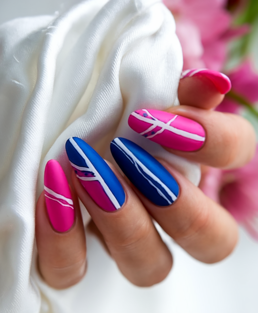 This trendy and unique nail design features a striking contrast between blue and pink, divided by crisp white geometric lines. The matte finish enhances the boldness of the colors, making the design modern and edgy. The long almond shape adds elegance, perfect for those who love structured yet minimal nail art.