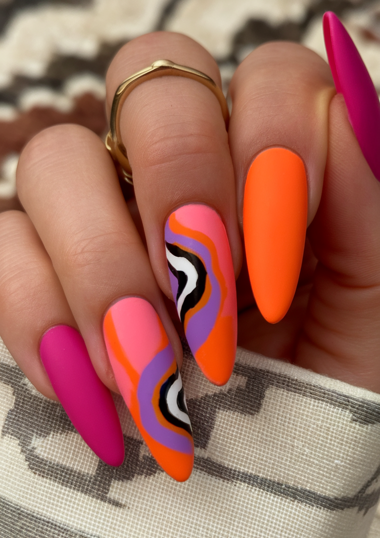 This boho nail look blends orange, purple, and pink in a flowing swirl design with crisp black and white accents. The matte finish adds a bold, high-fashion touch, while the long almond shape makes the pattern stand out. This is an excellent inspo for those who love vibrant, artistic nail art with a retro feel.