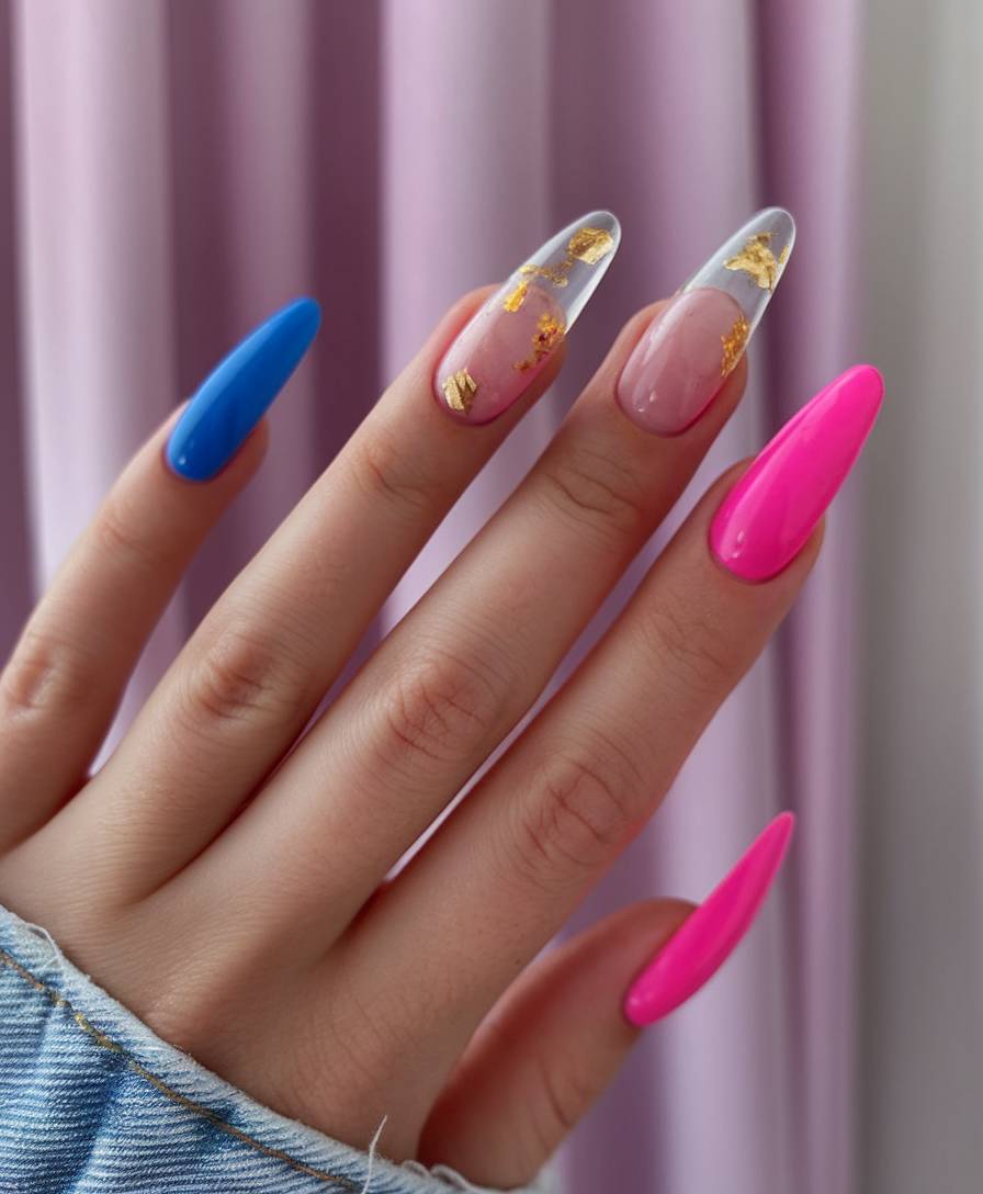 This trendy and unique design blends blue, pink, and transparent acrylic with gold foil accents for a luxurious effect. The long almond shape enhances the delicate balance between solid and sheer elements. The glossy finish and metallic details make this a fancy, high-fashion option for spring nail designs 2025.