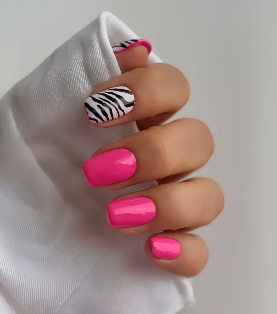 This cute and easy set features bold pink nails paired with a striking black and white zebra print accent. The short square shape keeps it practical while the glossy finish adds vibrancy. This trendy design is a great balance of fun and edgy, making it a statement look for the season.