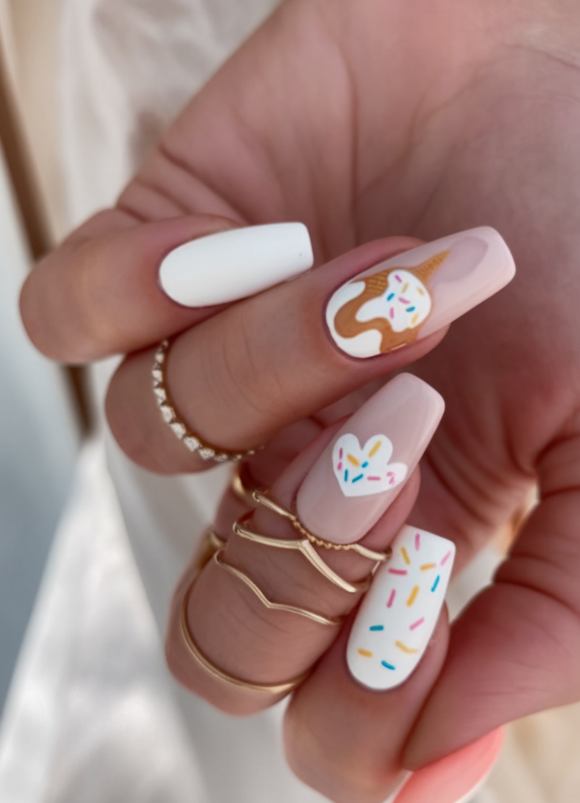 A pretty and playful design, this minimal nail art features soft white and nude tones with hand-painted sprinkles and an adorable ice cream cone. The long square shape allows for intricate detailing, making this a whimsical boho choice. The pastel sprinkles add a pop of color, making it a perfect spring nail designs 2025 look for those who love fun and creative styles.