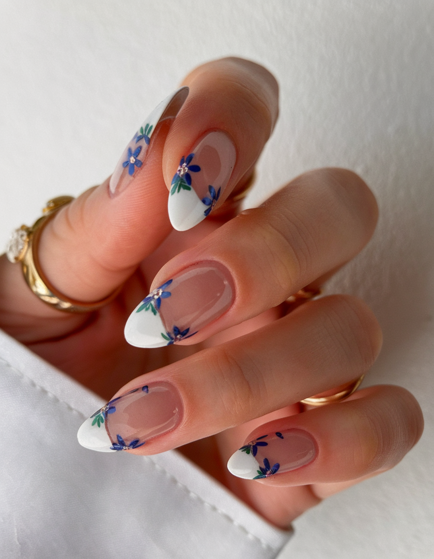 A pretty and minimal take on classic French tips, this design incorporates delicate blue flowers with subtle green leaves. The clear base gives the nails an airy, fancy feel, while the short to long almond shape keeps them elegant. This set is a fresh and cute choice for the season, perfect for anyone looking for timeless beauty with a floral twist.