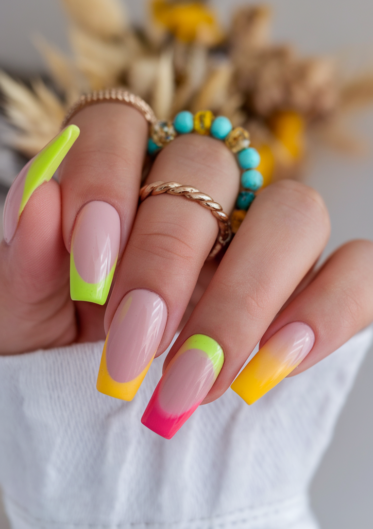 This boho and trendy nail design features a nude base with pink, yellow, and green ombre French tips. The long square shape adds a modern twist, while the seamless blending of colors gives the set a fresh and playful aesthetic. Perfect for those who love fancy yet easy nail art that makes a bold statement.