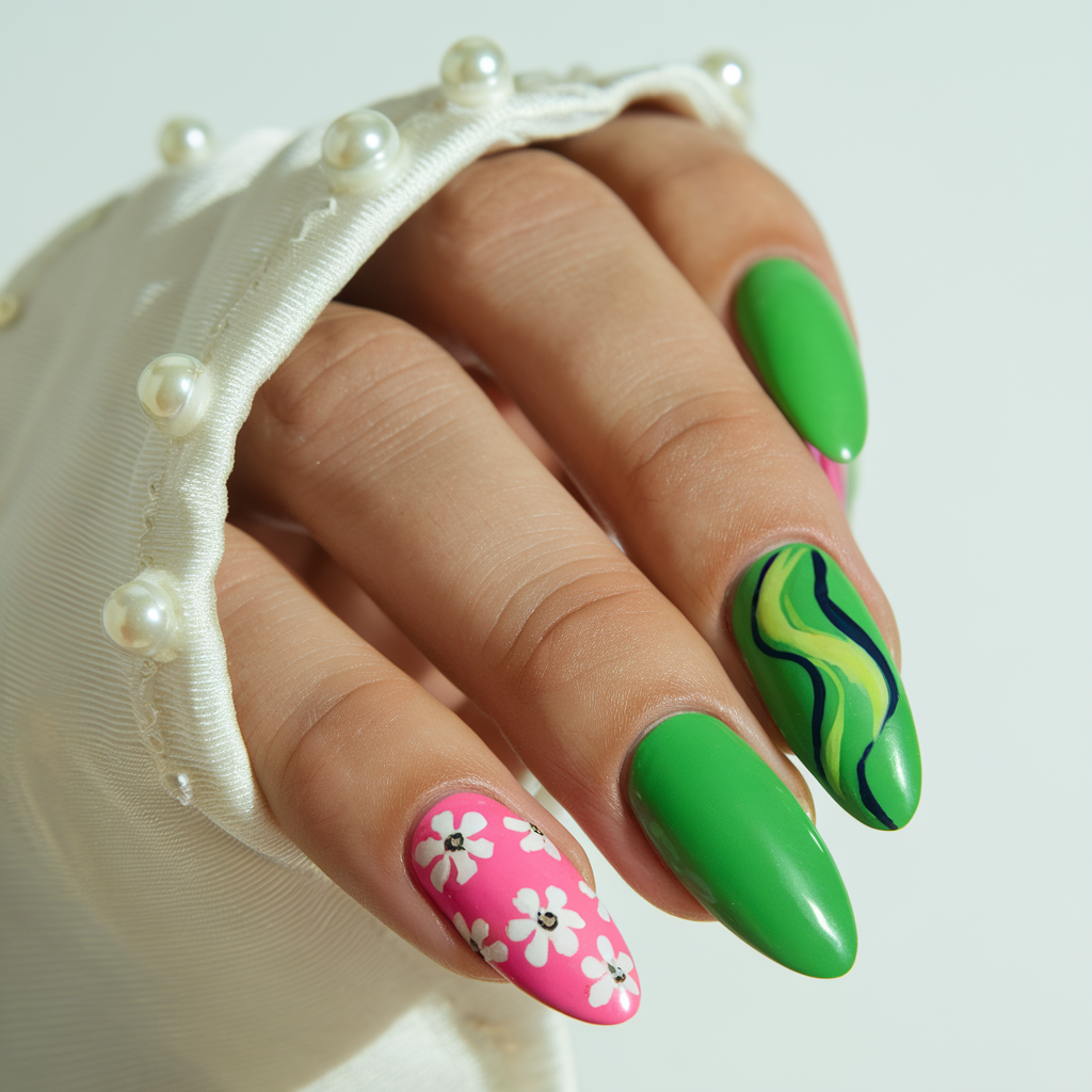 This trendy and boho nail set features a striking combination of green and pink with a mix of floral and abstract wave designs. The long almond shape provides an elegant base for the hand-painted white flowers, while the wavy accent adds a modern touch. This pretty and lively manicure is a great choice for spring nail designs 2025.