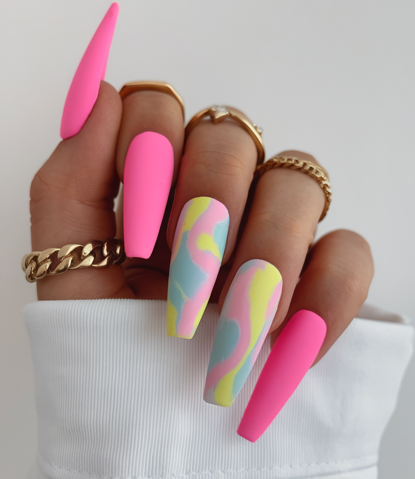 This long, matte nail set is an explosion of color, featuring pink, blue, teal, and yellow in an abstract swirl pattern. The mix of vibrant hues and soft pastels creates a bold yet subtle contrast, making it a fancy option for those who love eye-catching nail art. The smooth sns finish enhances the colors, adding depth to the look.
