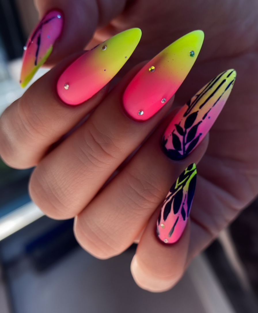 A unique and fancy design, these long almond nails feature a pink to yellow gradient with delicate black botanical prints. Tiny rhinestones enhance the matte finish, adding a touch of sparkle to the bold color shift. The artistic floral detailing makes this a standout look for those who love trendy and expressive nail art.