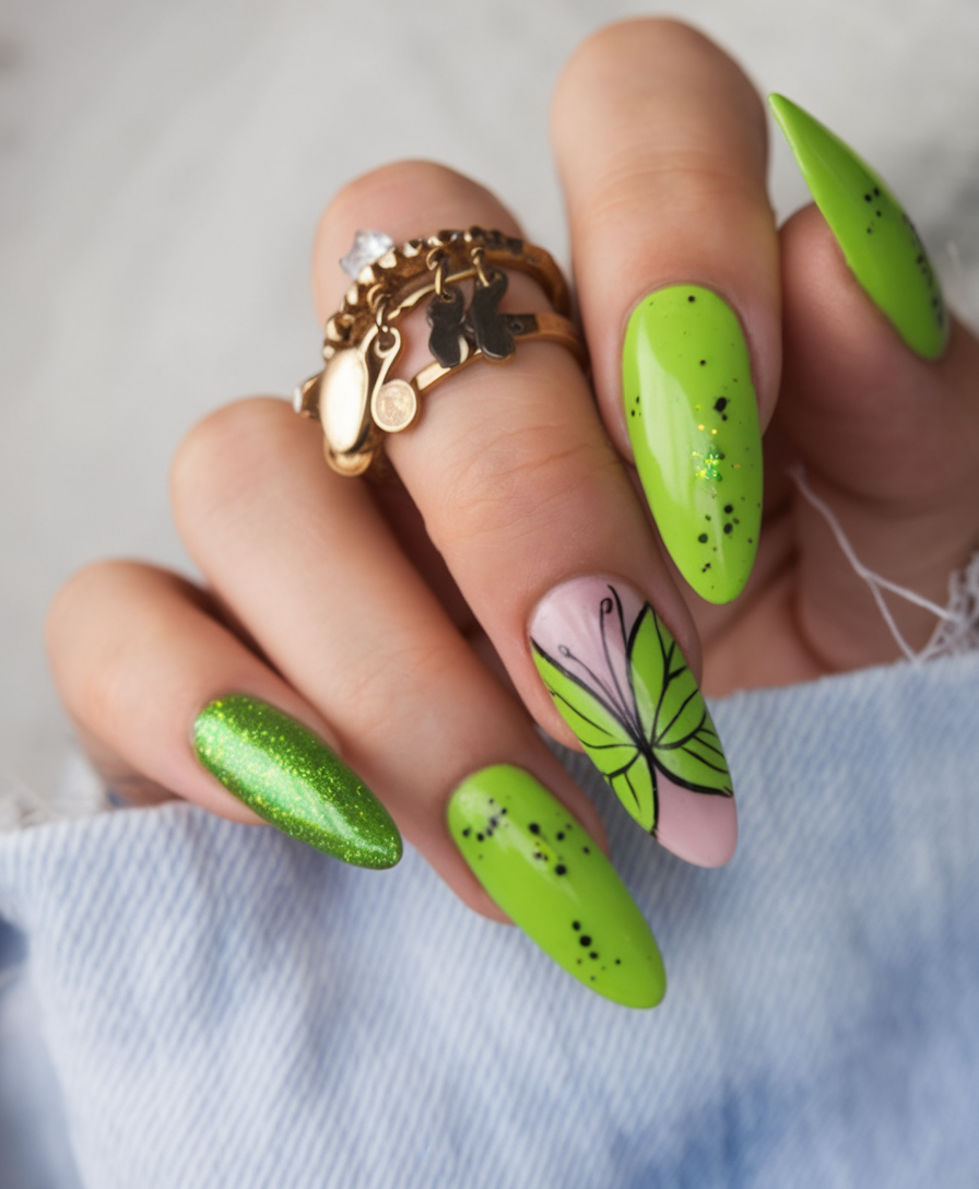 This cute and minimal nail set highlights soft green tones with a mix of shimmer, solid color, and delicate butterfly art. The long almond shape enhances the fluidity of the hand-drawn design, while subtle black speckles add depth. This pretty and nature-inspired manicure is perfect for a fresh, spring nail designs 2025 look.