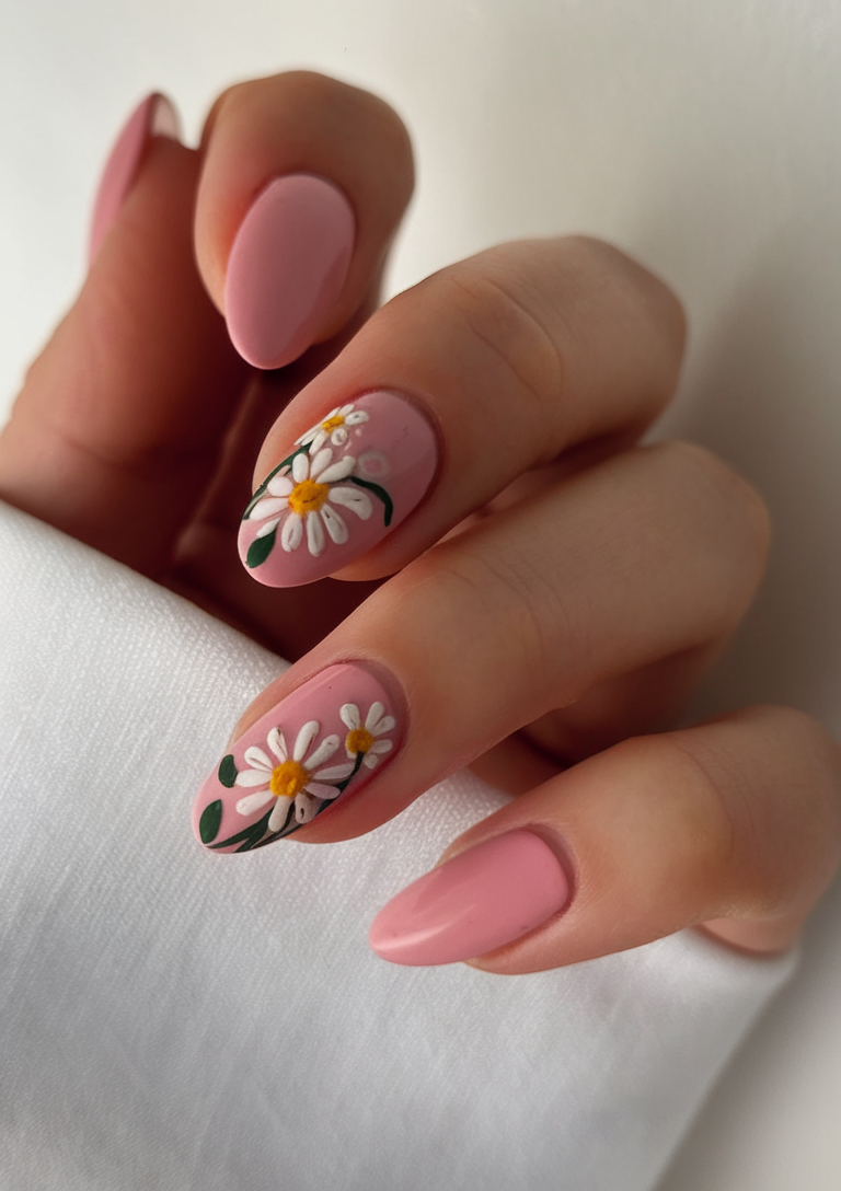 A romantic and feminine nail design featuring a soft pink base with delicate white daisies. The flowers are hand-painted with realistic green stems and a vibrant yellow center, adding a subtle yet eye-catching element to the manicure. The glossy finish enhances the intricate floral details, giving the nails a fresh and polished look.