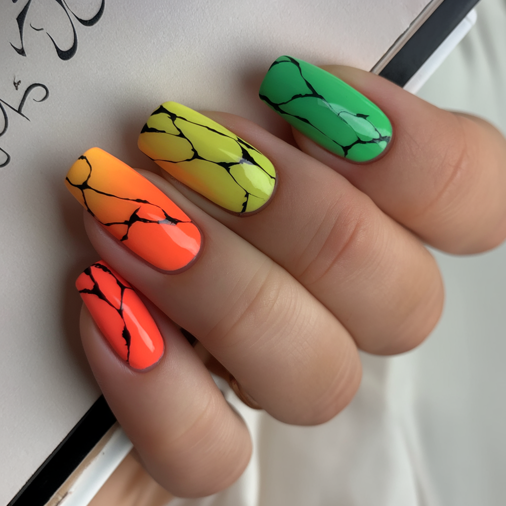 A fiery mix of neon orange, yellow, and green with a dramatic cracked effect running across each nail. The base colors are vibrant and attention-grabbing, while the black crackle detailing adds an edgy, artistic touch. The glossy top coat ensures that the colors stay vivid and sharp.