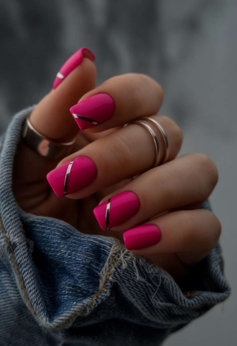 This manicure features a rich magenta base with a glossy finish, complemented by thin metallic silver lines strategically placed to add a sleek, modern edge. The short, square-shaped nails provide a contemporary look, making this design both stylish and practical. The contrast between the deep pink hue and the reflective silver accents creates a bold yet sophisticated aesthetic.