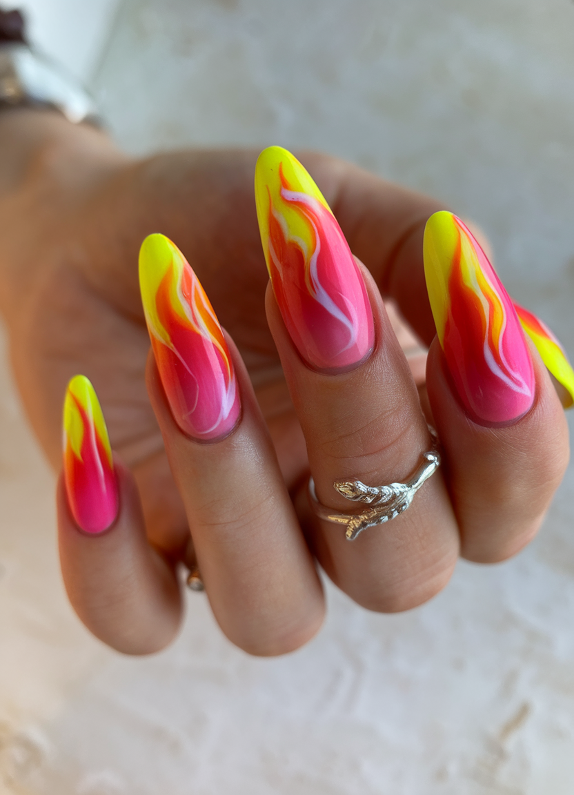 A daring and eye-catching look, this set blends hot pink, orange, and yellow in a smooth ombre effect before adding flame-like swirls in white and yellow. The almond shape enhances the fiery movement of the design, giving it a dynamic and edgy appeal. The fluidity of the flames and the neon intensity make this a standout option for those who love bold statement nails.