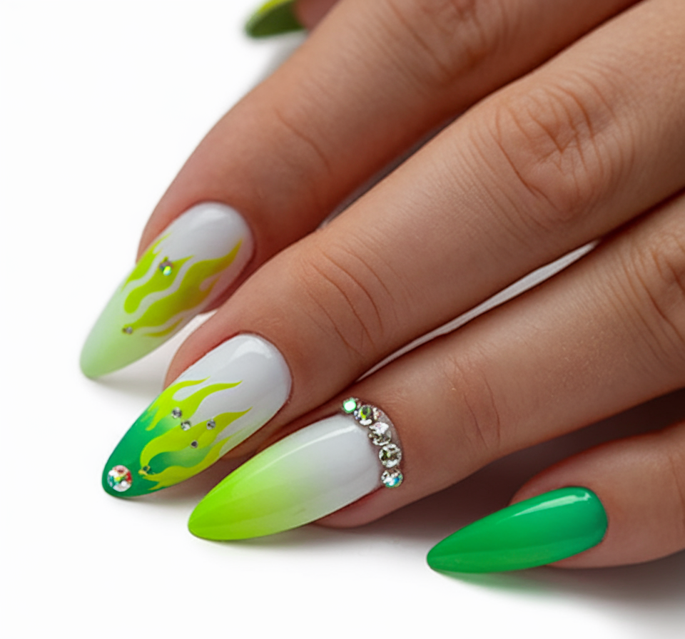 This electrifying set combines crisp white with vivid green in an ombre effect, enhanced by flame-like patterns that add an edgy touch. The addition of rhinestones elevates the design, making it feel extra luxurious. The almond shape balances out the bold colors, making it an ideal fusion of elegance and drama. The high-gloss finish ensures these nails pop from every angle.