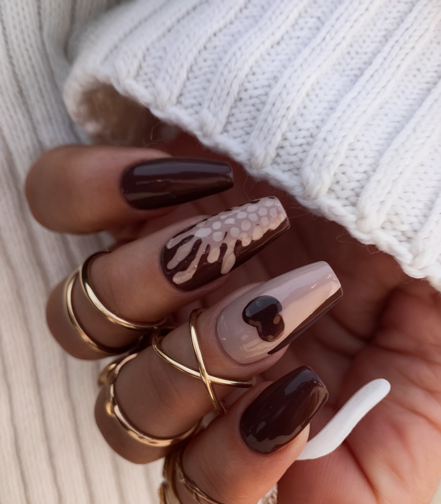 These nails bring a deliciously rich aesthetic with deep chocolate brown and creamy beige tones. The glossy finish enhances the luxurious depth of the brown, while accent nails mimic dripping melted chocolate and polka-dotted cocoa swirls, adding a playful yet sophisticated touch. The almond shape keeps the look elegant and wearable, making it a perfect balance between trendy and timeless.