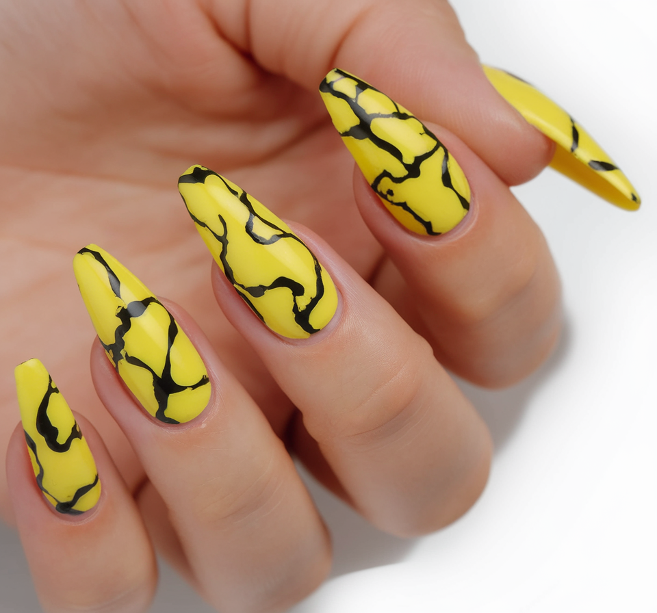 Bold and unapologetically fierce, this neon yellow manicure is brought to life with a black crackle pattern that gives a lightning-strike intensity. The matte finish enhances the high-contrast effect, making the nails appear almost electrified. The black veining effect varies in thickness, adding an organic yet edgy aesthetic, perfect for making a statement look.