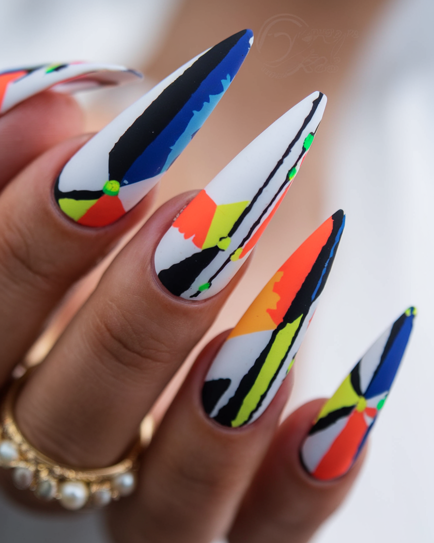 This trendy and unique design features sharp, geometric shapes in blue, orange, and green on a crisp white matte base. The stiletto shape enhances the edgy, high-fashion appeal, while the intricate detailing adds an artistic touch. The unexpected color combinations make this an eye-catching option for those who love fancy and bold nail art.