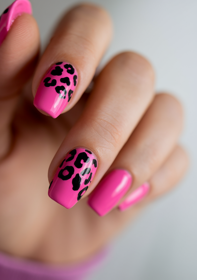 A cute, easy, and pretty design, this hot pink set is elevated with bold black leopard print accents. The short square shape keeps it basic yet stylish, making it perfect for everyday wear. The glossy finish enhances the vibrancy of the color, while the animal print gives it a playful and confident edge.