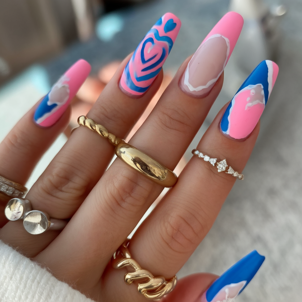 This boho and subtle nail look blends blue and pink hues with delicate, hand-painted swirl patterns. The long coffin shape allows for intricate detailing, with elements of negative space and a soft matte finish for a modern touch. This design is perfect for those seeking spring nail designs 2025 that are both artistic and effortlessly chic.