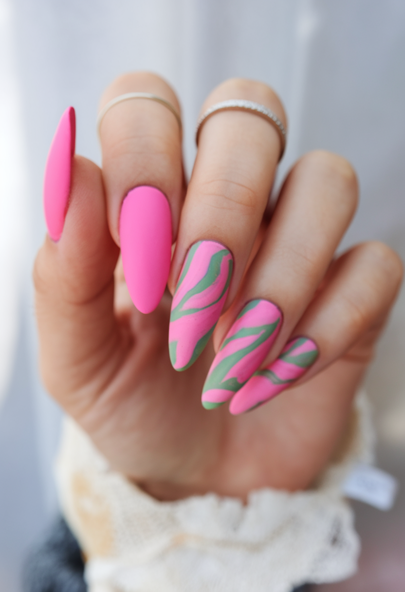 This trendy nail design features a bold combination of pink and green in an abstract swirl pattern. The matte finish enhances the contrast between the colors, giving the set a modern yet boho aesthetic. The long almond shape adds elegance, making this an ideal spring nail designs 2025 choice for those who love artistic yet minimal styles.