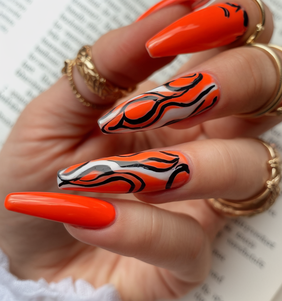 A bold and unique set, these long nails feature a fancy orange base with swirling black and white accents. The high-gloss finish gives the design a striking depth, making it a statement choice for those who love edgy, high-energy nail art. This look embraces a mix of abstract and sns techniques, creating an electrifying effect.