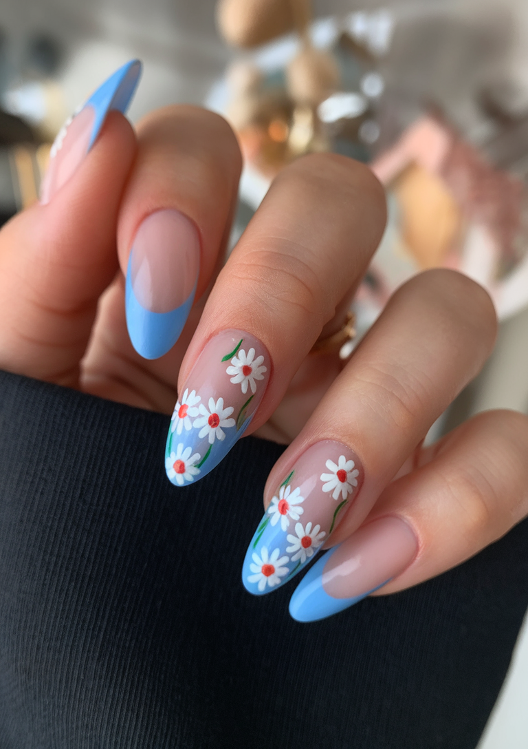 For a pretty and delicate spring look, these blue French tips are adorned with hand-painted white daisies and subtle green stems. The minimal floral accents add a touch of nature-inspired charm, making them a perfect cute choice for the season. The short to long almond shape enhances the soft, elegant aesthetic, perfect for those who prefer a fresh yet stylish nail design.