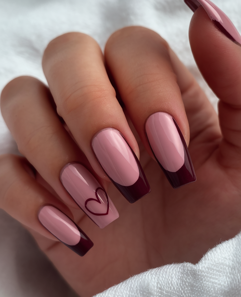 This pink and burgundy French tip design brings a romantic twist to spring nails coffin 2025. The glossy acrylic pastel base is paired with deep wine-colored tips, creating a chic contrast. A single cute heart accent on the ring finger enhances the overall elegance without being overwhelming. This simple yet refined design is perfect for both casual and formal occasions.