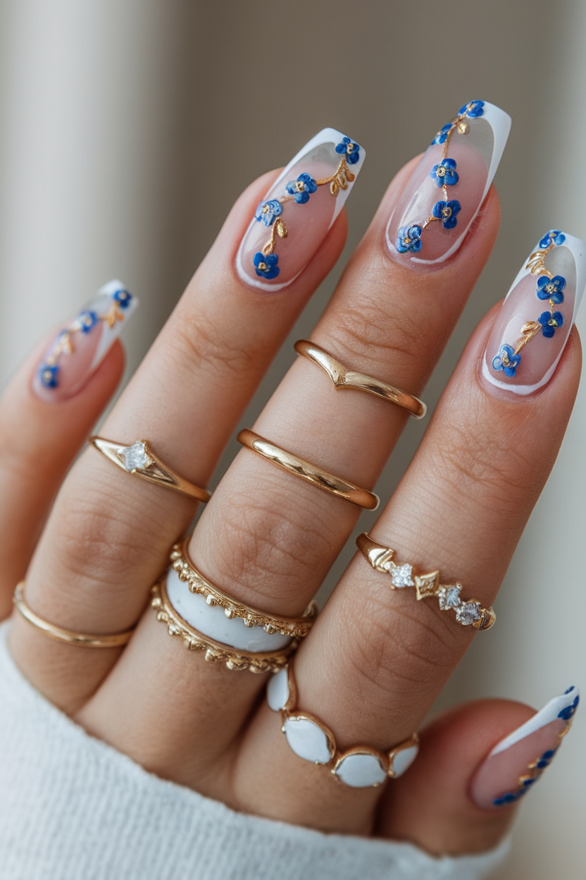 This spring nails coffin 2025 set embraces an airy, romantic feel with intricate blue floral details. The transparent base enhances the design, making the hand-painted flowers and gold accents stand out beautifully. A classic white French tip adds a refined touch, keeping the manicure fresh and elegant. This acrylic pastel look is perfect for those who love a soft yet artistic take on floral nail art.