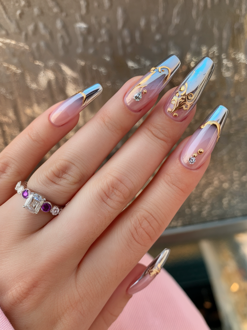 #17 Chrome and Gold Coffin Nails with Crystal Accents