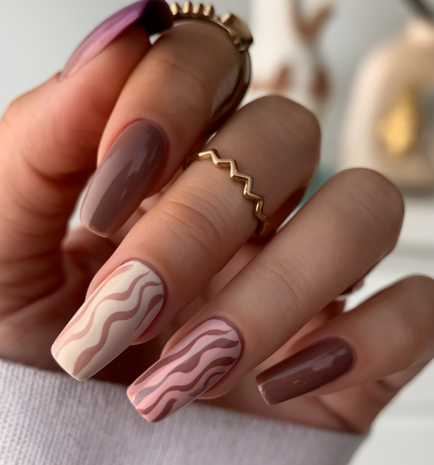 A modern and minimal spring nails coffin 2025 set, this manicure plays with neutral tones and flowing wavy patterns. The mix of warm beige, soft pink, and chocolate brown creates a chic yet understated look. Some nails feature a solid glossy finish, while others showcase a delicate wavy design for a balanced, trendy aesthetic. This acrylic simple style is perfect for those who prefer elegant yet artistic nail art.