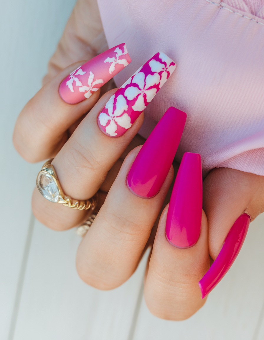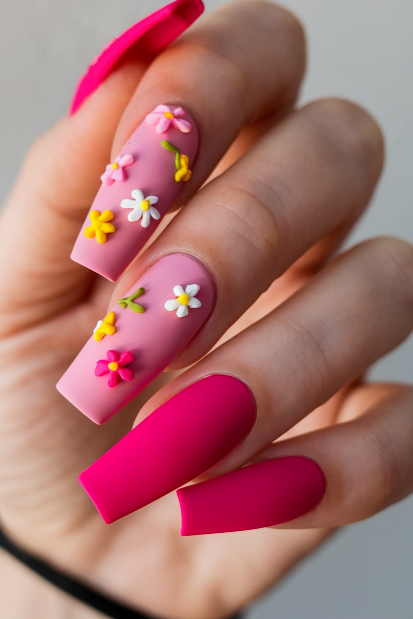 For a striking spring nails coffin 2025 look, this design combines pink gradients with bold white floral art. Some nails feature a matte finish, while others have a glossy top coat, adding dimension to the overall design. The intricate hand-painted flowers provide a beautiful contrast, making this a standout acrylic pastel style. This long and cute floral manicure is ideal for anyone who loves vibrant spring-inspired nail designs.