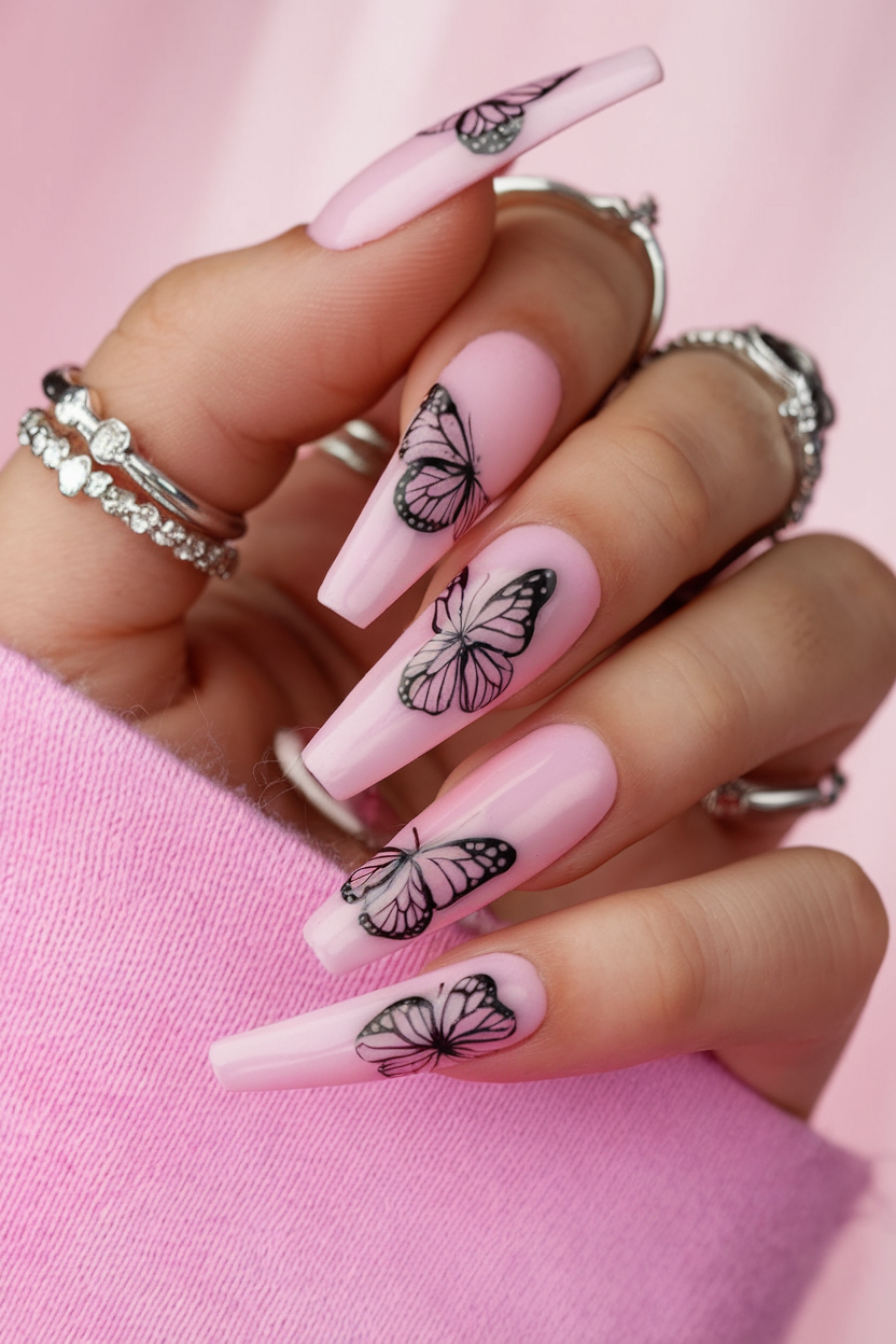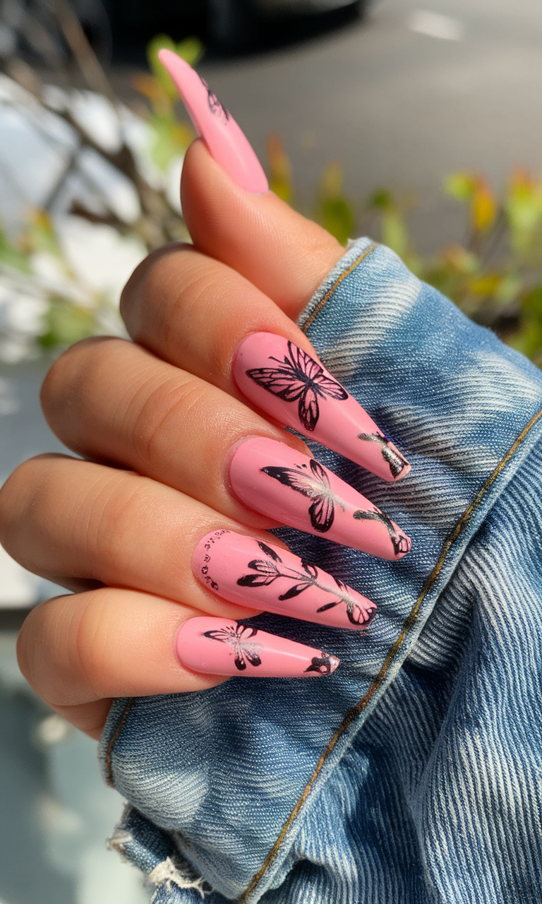 A dreamy and delicate take on spring nails coffin 2025, this manicure features a soft pink base adorned with detailed black butterfly designs. The intricate linework adds a sense of movement, creating a whimsical and airy effect. A glossy finish enhances the elegance of this acrylic pastel look, making it an ideal choice for a graceful and feminine style. This long nail design is perfect for those who appreciate delicate yet impactful nail art.