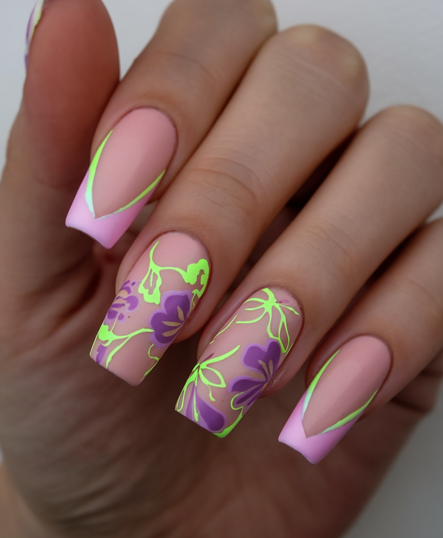 A lively take on spring nails coffin 2025, this manicure combines pink French tips with striking purple and green floral patterns. The contrast of neon detailing against the soft acrylic pastel base adds a bold, artistic touch. The design is enhanced by fine linework, making it a standout style for those who enjoy intricate, hand-painted nail art. This long nail set is a perfect mix of elegance and vibrancy.
